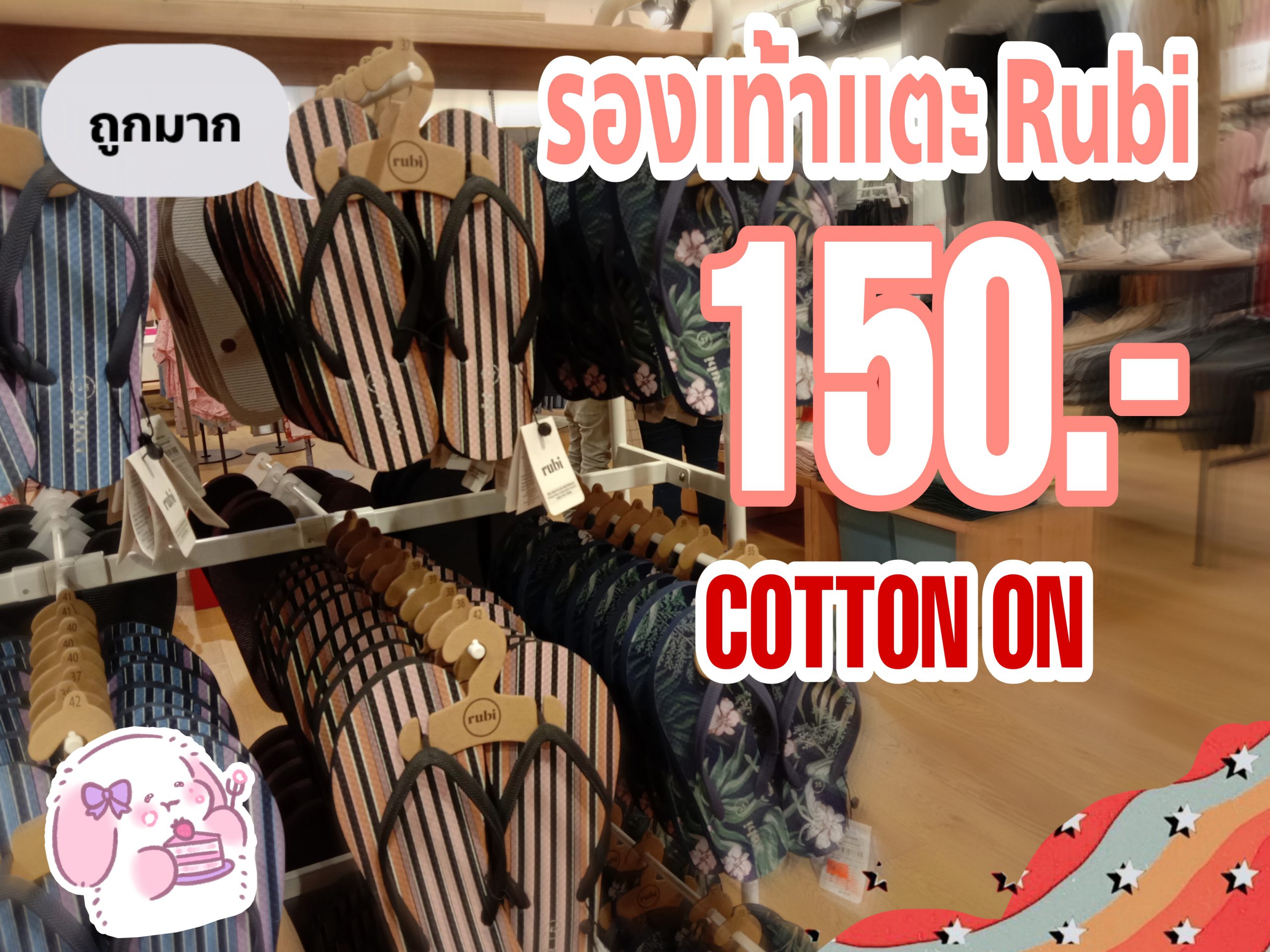 และวันนี้แอดก็มีรองเท้าแตะมาแนะนำนั่นก็คือ แบรนด์ Rubi แบรนด์น้องจาก COTTON ON ที่ไม่ได้แค่ใส่สบายอย่างเดียว แต่ยังเอาใจสาวๆที่ชื่นชอบความน่ารัก โดยมีลวดลาย สีสัน ที่น่ารักสดใส มากมายให้สาวๆได้เลือกเป็นเจ้าของ ในราคาที่เหลือเพียง 150 บาท เรียกได้ว่า คุ้มและถูกแบบสุดๆไปเลยค่ะ